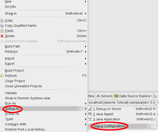 Pronto! Agora para debugar a aplicação no eclipse, clique com o botão direito na classe desejada e selecione a opção “DEBUG AS” seguido da opção “Debug Configuration”.