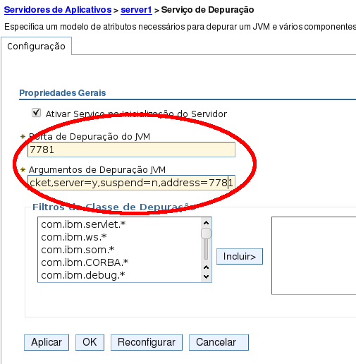 Agora insira no campo “Porta de Debugação do JVM” o valor 7781 e no campo “Argumentos de Debugação JVM” o a string a seguir: