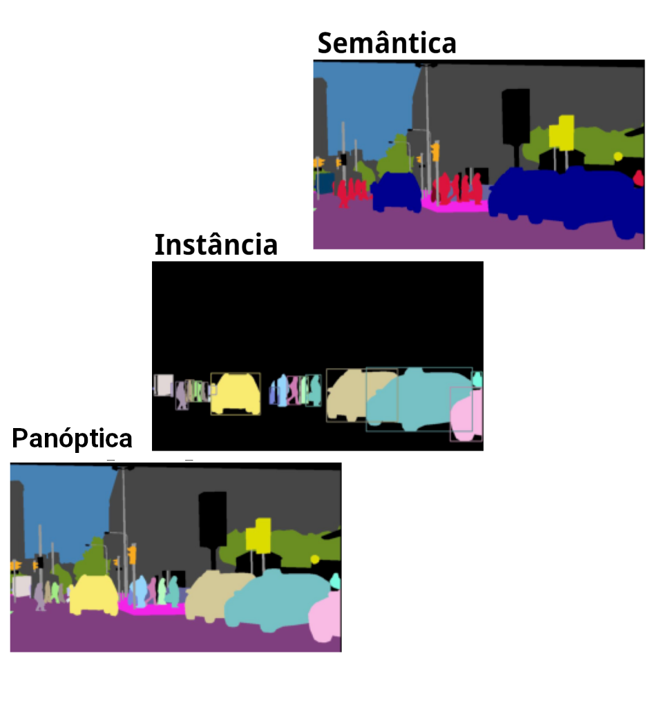 Abaixo uma imagem que explica claramente a diferença entre segmentação Panótica, Instância e Semântica. A segmentação de semântica agrupa as instâncias de objetos, na segmentação de instância separa todas as instancias de objetos ( assim permitindo distinguir os pixels de cada objeto), já a segmentação panótica sera todos os pixels (camadas, instancias e objetos).