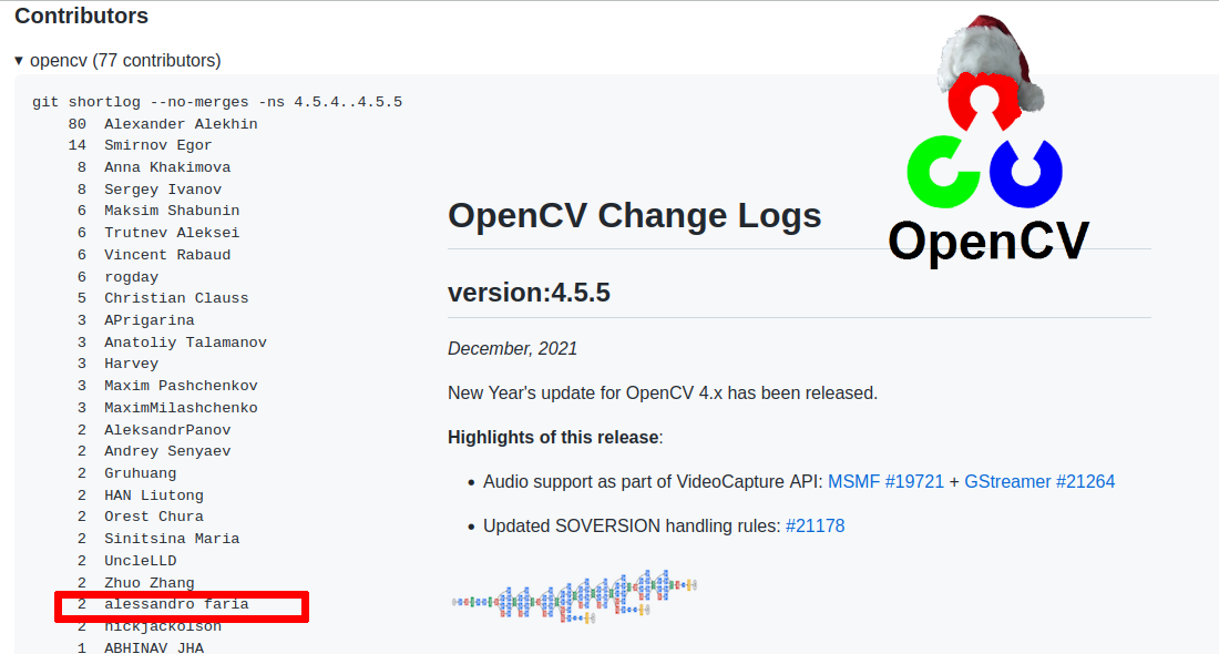 Versão 4.5.5 da biblioteca openCV foi lançada com diversas novidades. Como suporte a áudio na API VideoCapture, otimização ao RISC-V, suporte ao OpenVINO 2021.4.2 LTS release atualização do exemplo do módulo videoio da câmera realsense e muito mais. Todos os detalhes aqui: https://github.com/opencv/opencv/wiki/ChangeLog