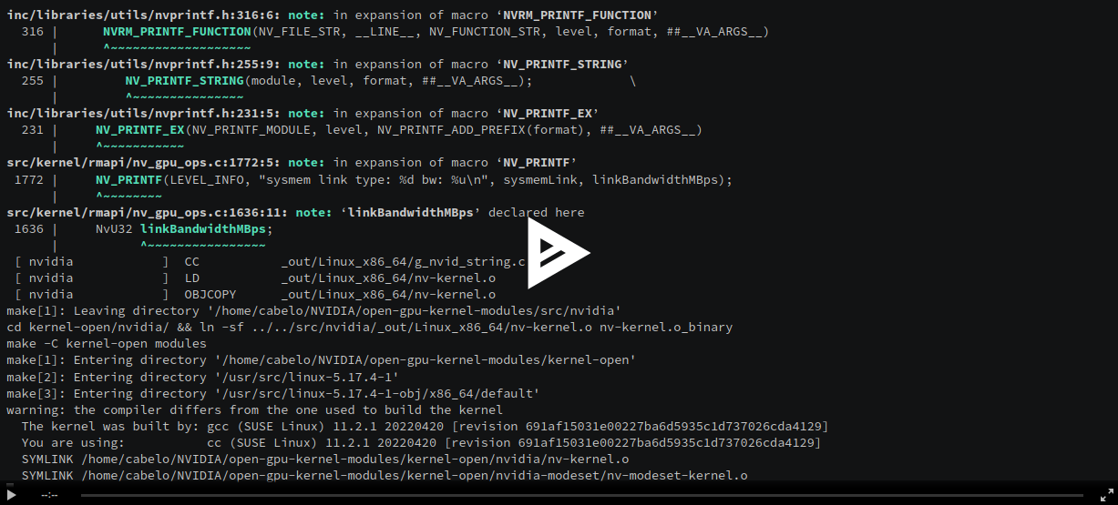 $ git clone https://github.com/NVIDIA/open-gpu-kernel-modules $ cd open-gpu-kernel-modules $ make modules -j`nproc` $ sudo make modules_install -j`nproc`