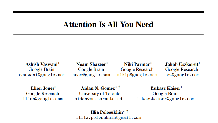 [1] Vaswani, Ashish; Shazeer, Noam; Parmar, Niki; Uszkoreit, Jakob; Jones, Llion; Gomez, Aidan N; Kaiser, Lukasz; Polosukhin, Illia. (2017). “Attention Is All You Need”. arXiv:1706.03762 [cs]. arXiv.org, http://arxiv.org/abs/1706.03762.