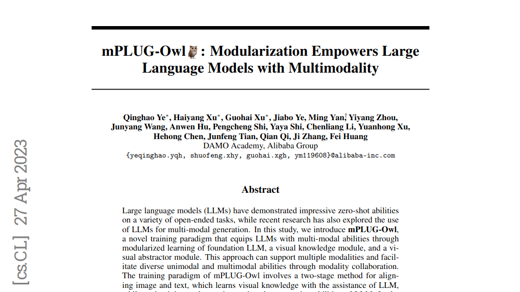 [1] Qinghao Ye, Haiyang Xu, Guohai Xu, Jiabo Ye, Ming Yan, Yiyang Zhou, Junyang Wang, Anwen Hu, Pengcheng Shi, Yaya Shi, Chenliang Li, Yuanhong Xu, Hehong Chen, Junfeng Tian, Qian Qi, Ji Zhang, Fei Huang (2023). “mPLUG-Owl: Modularization Empowers Large Language Models with Multimodality”. arXiv:2304.14178 [cs]. arXiv.org, https://arxiv.org/abs/2304.14178