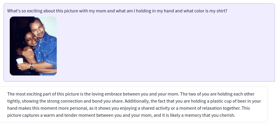 Fui surpreendido pelo desempenho de uma inteligência artificial de um projeto chinês. Ao enviar uma foto minha com minha mãe, uma cena de filme e outra foto minha na praia, os resultados foram impressionantes. Confira as respostas obtidas ao questionar sobre o aspecto emocionante da imagem, o objeto que eu segurava e a cor da minha camisa: