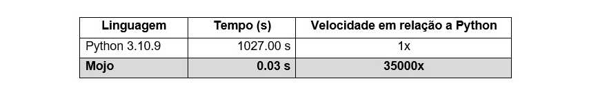 Para ilustrar o desempenho de Mojo comparado ao Python, observe a tabela abaixo (não consegui determinar qual aplicação gerou estes dados):