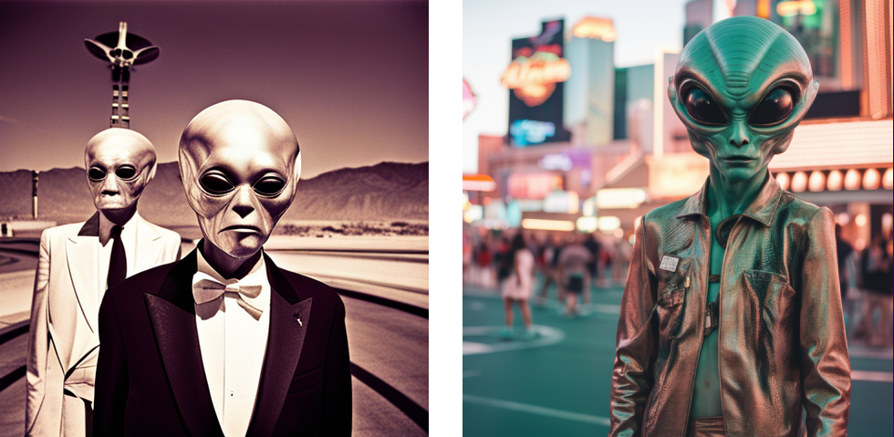 Prompt: ✨aesthetic✨ aliens walk among us in Las Vegas, scratchy found film photograph