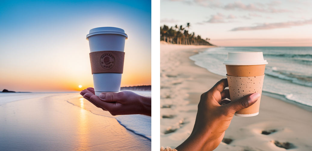 Prompt: *~aesthetic~*~ manicured hand holding up a take-out coffee, pastel chilly dawn beach instagram film photography