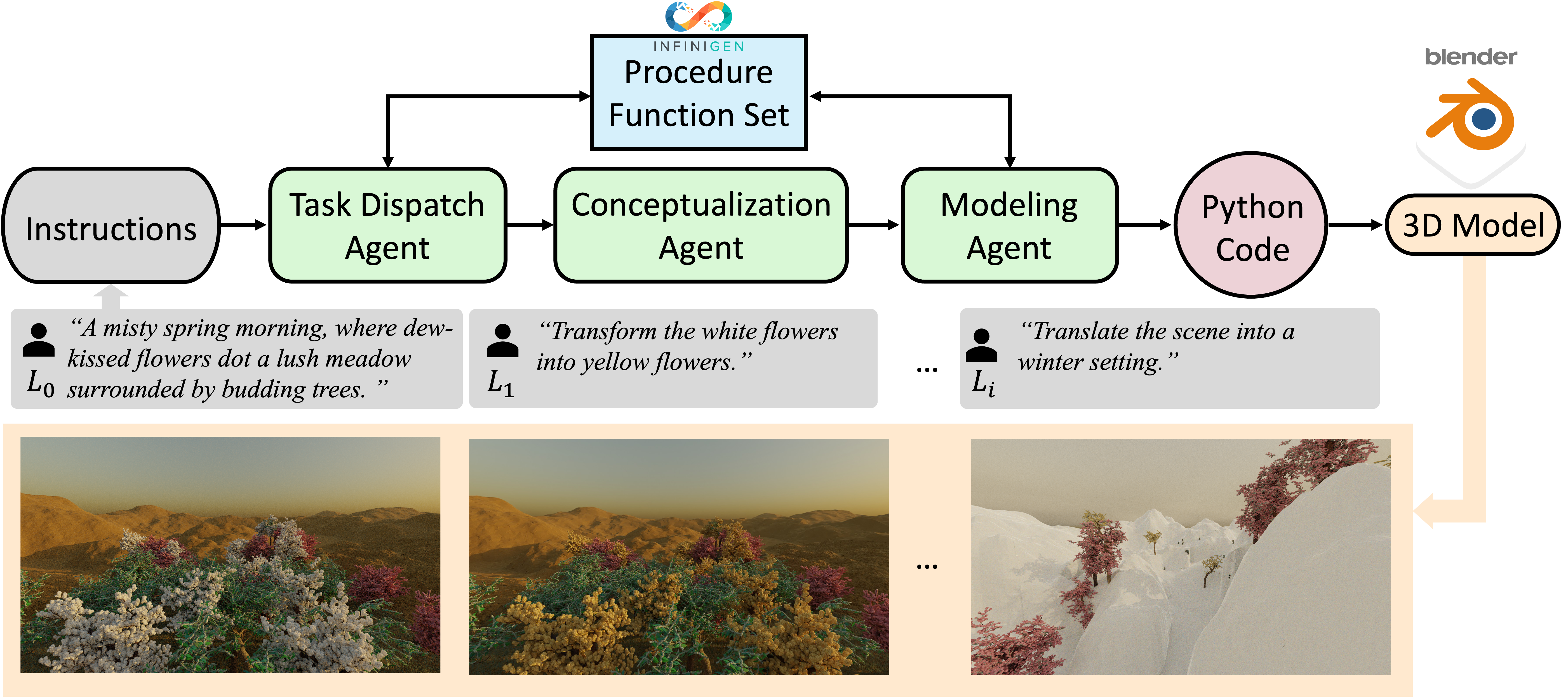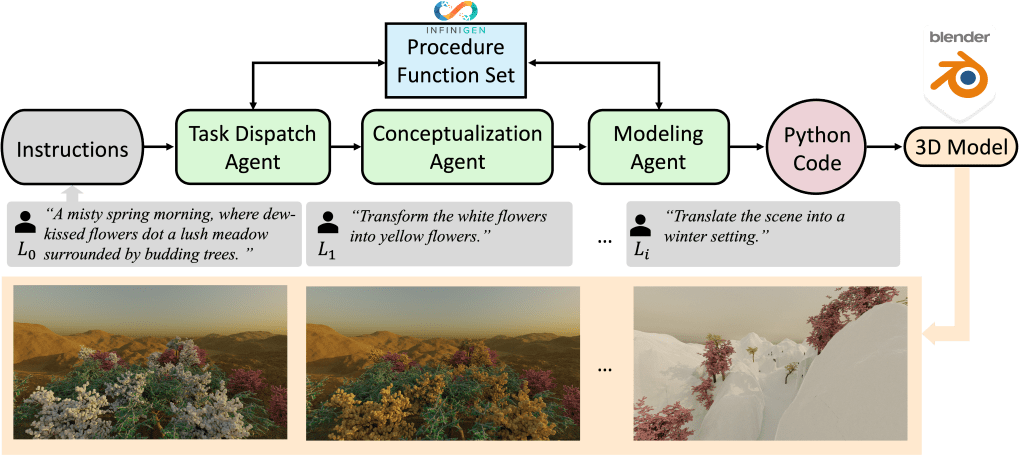O 3D-GPT é estruturado com a presença de três agentes fundamentais que desempenham papéis específicos: o agente de despacho de tarefa, responsável por organizar e delegar funções; o agente de conceituação, que interpreta e conceitua as diretrizes; e o agente de modelagem, encarregado do processo de construção e modelagem 3D em si. Trabalhando de forma integrada, estes agentes coletivamente perseguem dois propósitos de grande importância. O primeiro deles envolve um aprimoramento sistemático e consistente das descrições iniciais da cena, que são breves e sucinta. Estas descrições são progressivamente transformadas e evoluídas para representações mais detalhadas e complexas, ao mesmo tempo que o 3D-GPT ajusta e modifica dinamicamente o texto, levando em consideração as instruções adicionais que são fornecidas ao longo do processo. Como segundo objetivo, o 3D-GPT se empenha em incorporar de maneira fluida e contínua técnicas de geração procedural. Isto é realizado através da extração de valores específicos de parâmetros presentes no texto enriquecido, facilitando assim a interface e integração com programas especializados em 3D, otimizando a criação de ativos digitais.