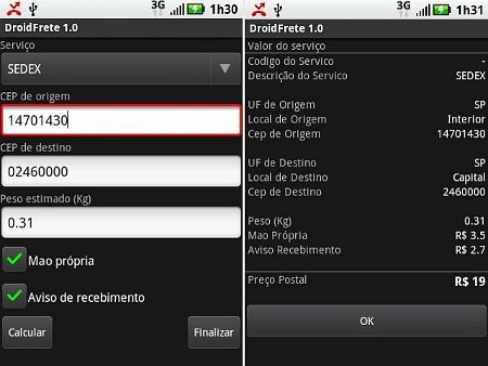 droidFrete é um aplicativo que permite calcular o valor postal de remessas via correio no Brasil. Este aplicativo exibe o valor obtido no servidor do correio via webservice.