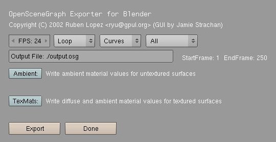 $ wget http://projects.blender.org/frs/download.php/348/osgexport-2.42b.tar.gz $ osgexport-2.42b/ $ sudo cp osgexport-2.42.py /usr/lib64/blender/.blender/scripts